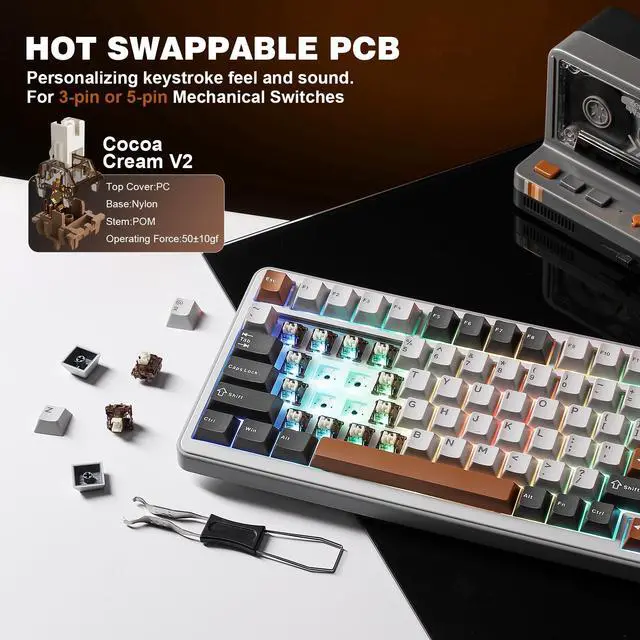 Hot swappable mechanical keyboard takes full-key hot-swappable sockets and ultra-responsive, low-latency. The premium PCB board of the custom keyboard is compatible with 3-pin/5-pin switches, to meet your desired typing feel, whether it's for gaming, typing, or creative endeavors. Pre-lubed linear and tactile switches have a unique design, solid sound, and excellent keystroke feel.