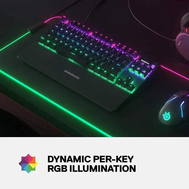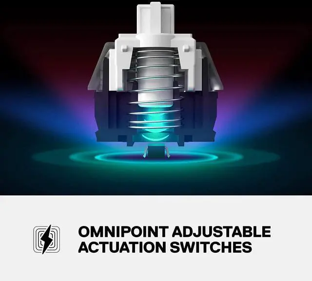 The apex pro TKL mechanical keyboard solves the shortcomings of gaming keyboards thanks to Omni point mechanical switches, which are for 100 million keypresses. Each individual key can be tweaked to meet your desired actuation, from the world's fastest feather light touches, to deep and typo-free presses, and anything in between, allowing you to play more accurately, quickly, and confidently. An integrated OLED smart display with on-board storage is your integrated command center for on-the-fly info from your game, music, or discord, and provides software-free customization for tweaking and saving your settings.