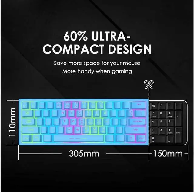 60% Compact keyboard, 100% Portablethis 60 percent wireless gaming keyboard is more compact and space-saving to sit on your desk and leave more room for your mouse movement. Its easier and super portable to travel with or carry around when youre out.