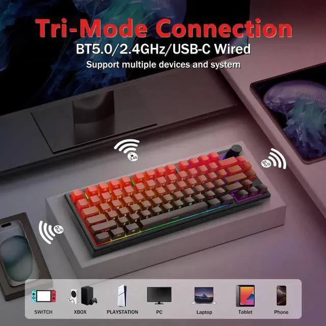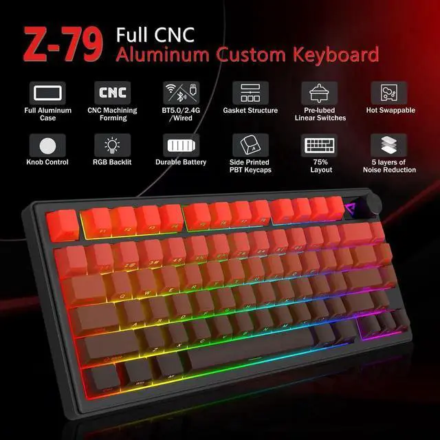 75% Wireless Mechanical Gaming Keyboard, Full Aluminum Shell, Creamy Sound, Bluetooth/2.4GHz/USB-C, Hot Swappable Pre-lubed Linear Switches, Gasket Structure, Metal Knob, RGB Light, Red