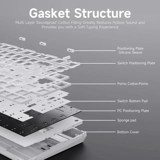 Gaming Keyboard, Gasket StructureThe NACODEX AK820 is a 75% gaming keyboard featuring the popular Gasket structure. By placing small spacers on the top and bottom covers to support the positioning plate, it largely avoids collisions between internal components and the hard shell during typing. Paired with multi-layer cotton noise insulation, it reduces hollow noise and delivers a softer, more comfortable typing experience.