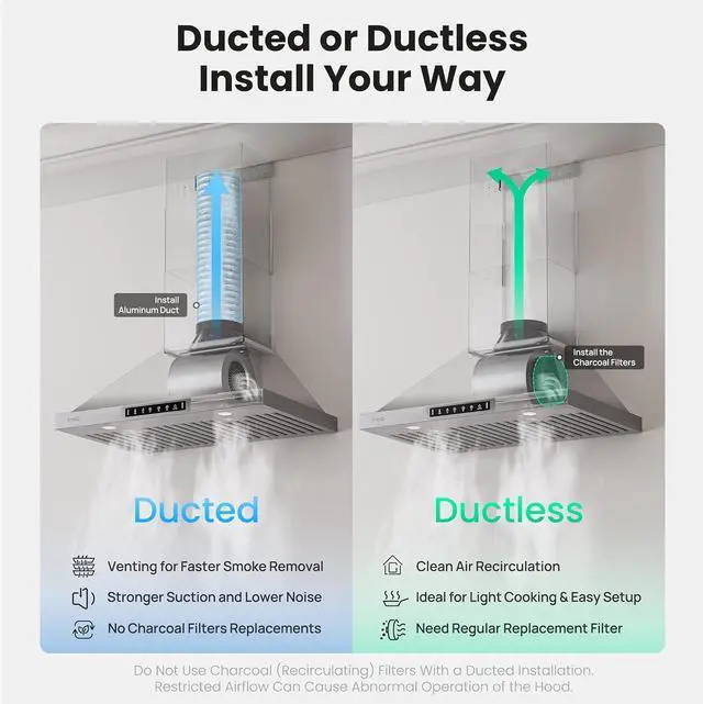 Premium Stove Vent HoodCrafted from 430-grade brushed stainless steel, the sleek pyramidal design of the wall mount range hood 30-inch complements most kitchen decors. Optional carbon filter kits are available for ductless installations, offering flexibility for any kitchen setup.