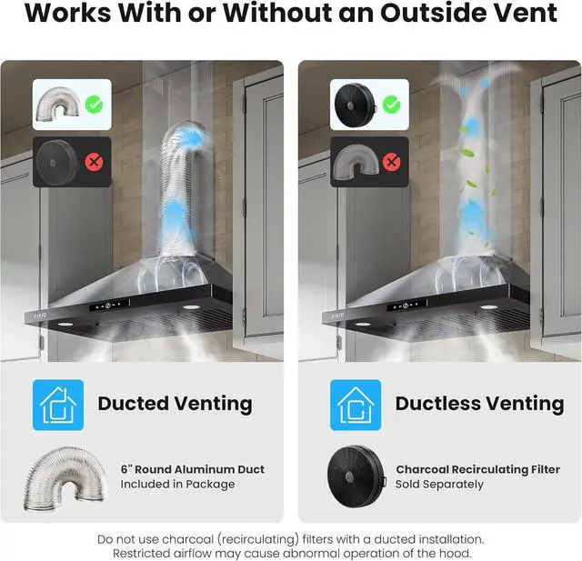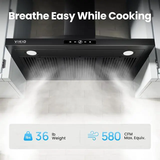 VIKIO HOME Wall Mount Range Hood 36 inch, 580 CFM Kitchen Vent Hood, Ducted/Ductless Convertible with Touch Control, Stainless Steel Stove Vent Hood, Easy Clean Filter, Black