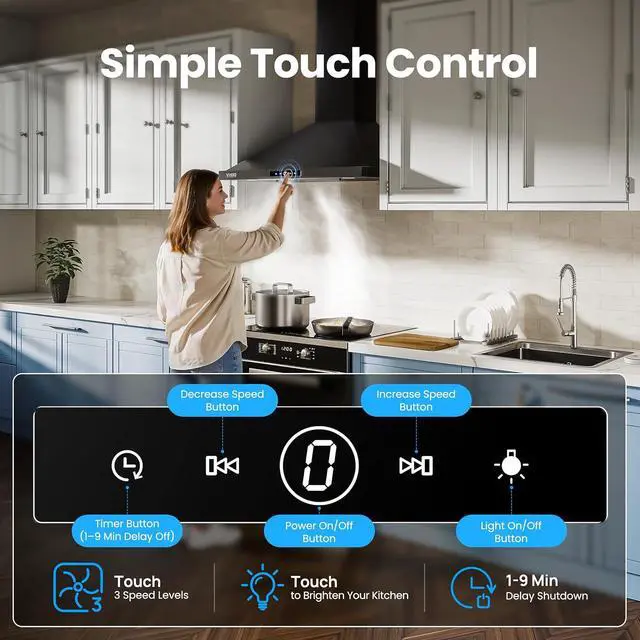 4. 1-9 Min Delay, Auto Clear OdorsThe intelligent delay function keeps the hood running for 1 to 9 minutes after you finish cooking. It automatically purges residual steam and stubborn odors (like from fish or hot pot), ensuring your kitchen returns to fresh air. Ideal for maintaining a truly clean and odor-free environment.