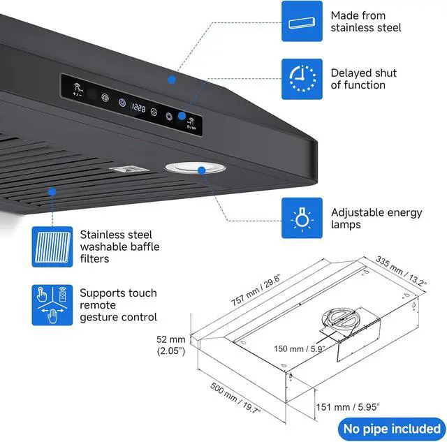 Touch Control and Remote ControlWith Smart LCD screen, touch control, stove vent hood can be operated remotely by remote control if you are taking care baby or playing with pets. Control simply and conveniently by time setting function.