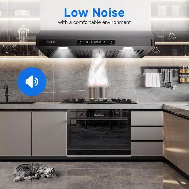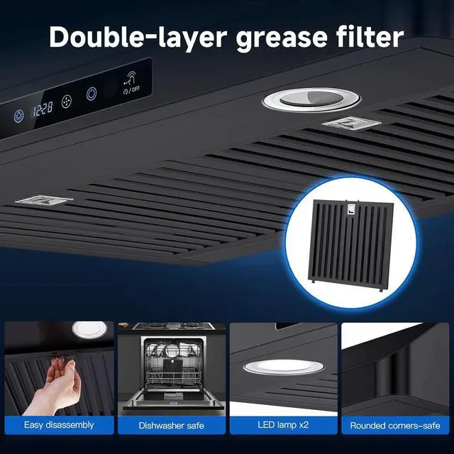Easy to Clean: Dishwasher-safeAMZCHEF kitchen vent hood contains 2 dishwasher-safe stainless steel filters, high temperature resistance and effective resistance to grease, stains and rust. easy to assemble/disassemble.