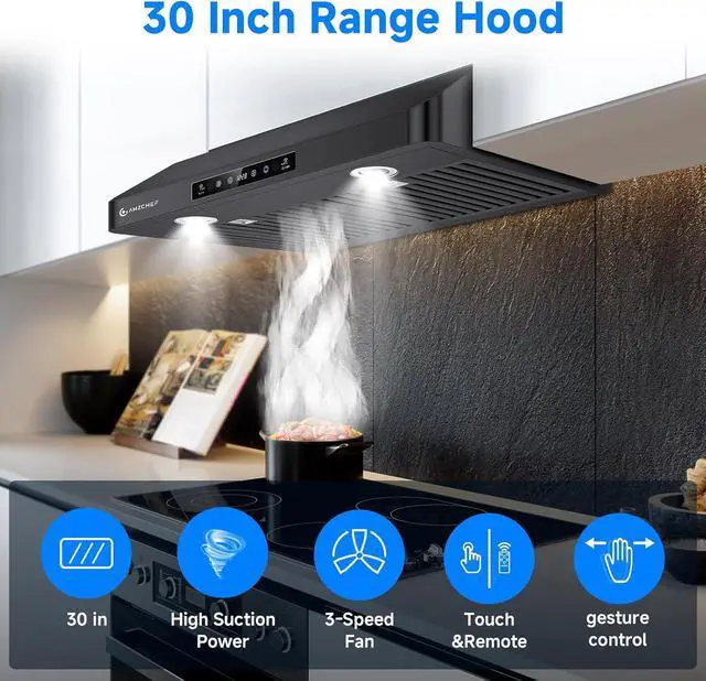 AMZCHEF Under Cabinet Range Hood 30 Inch, 750CFM Stainless Steel Kitchen Stove Vent Hood 3 Speed Exhaust Fan Touch/Remote/Gesture Control LED lights Time Setting Dishwasher-Safe Baffle Filters-Black
