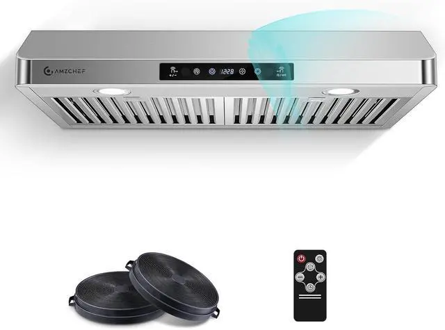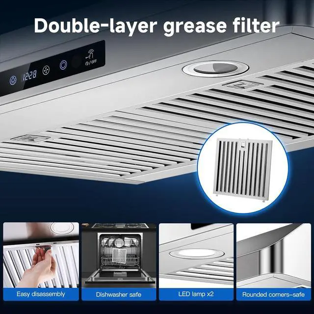 Easy to Clean: Dishwasher-safeAMZCHEF kitchen vent hood contains 2 dishwasher-safe stainless steel filters, high temperature resistance and effective resistance to grease, stains and rust. easy to assemble/disassemble.