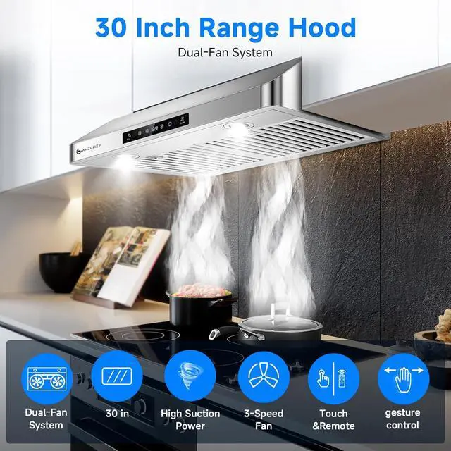 Stainless Steel Range HoodThe range hood 30 inch under cabinet is made of 430 stainless steel,not deform,protect the suction motor and prevent oil or smoke seeping out.