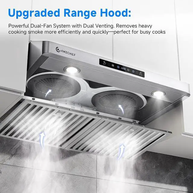 LED Lights and 3-Speed FanAMZCHEF undercabinet range hoods come with 2x1.5W LED lamps, provides bright lighting vision.Total 3 power levels fan, instantly exhaust vapour, smoke, oli from kitchen.Save energy and reduct harassment on housework.
