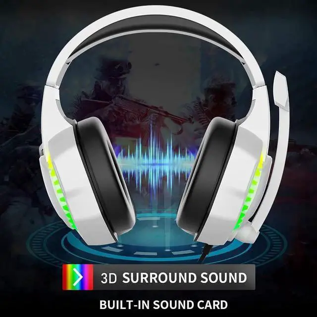 RGB BACKLIT GAMING HEADSETThis high-sensitivity wired gaming headphones has excellent 3D stereo surround sound and cool RGB lights. The adjustable noise reduction mic makes the sound transmission more accurate, clear and smooth, allowing you to enjoy games and music happily. 3.5 mm wired backlit earphones use soft protein cotton material to make the earmuffs comfortable to wear. Adjustable headphone strap, suitable for most players. (2 in 1 transfer line included).