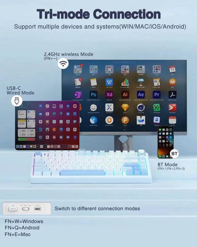 - Multi-function Control Knob: This AULA 75% wireless gaming keyboard is equipped with functional knob to switch gaming mode or office mode. In gaming mode, you can rotate the knob to adjust the brightness of the lights, and click the knob to switch the lighting effects easily; in office mode, rotate the knob to adjust the volume, and click the knob to play or pause. Long press the knob for about 5 seconds to switch modes