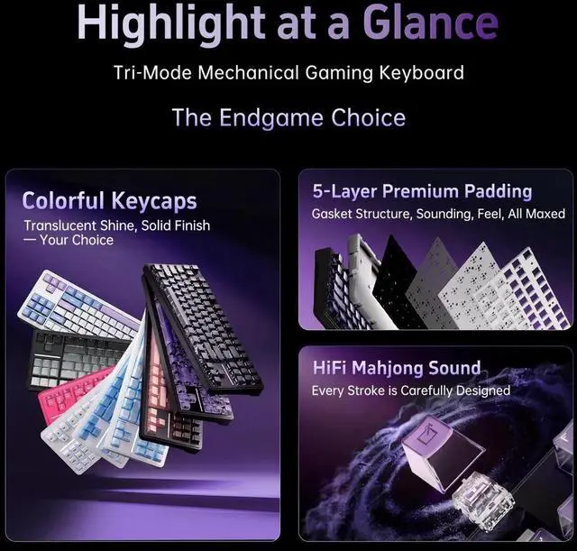 • HOT-SWAP & NKRO: Hot-swappable switch sockets; full N-Key Rollover (NKRO) for accurate input; south-facing LEDs compatible with PBT keycaps.
