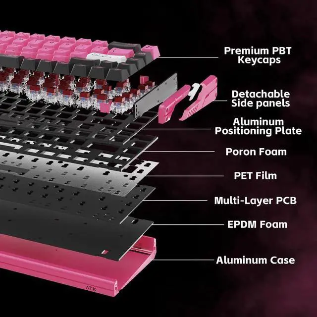 • Premium Build & Keycaps: CNC aluminum chassis with anodized/powder-coated finish; Cherry-profile double-shot PBT keycaps for durability and consistent feel.