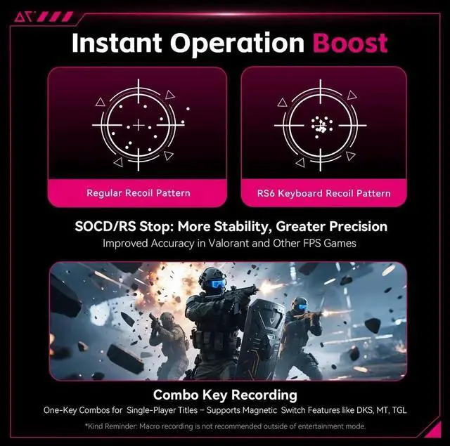 • 8K Polling & Pro Responsiveness: 8000 Hz polling with ~0.08 ms latency; 32K scan rate (full key) and 256K per key for ultra-responsive competitive play.