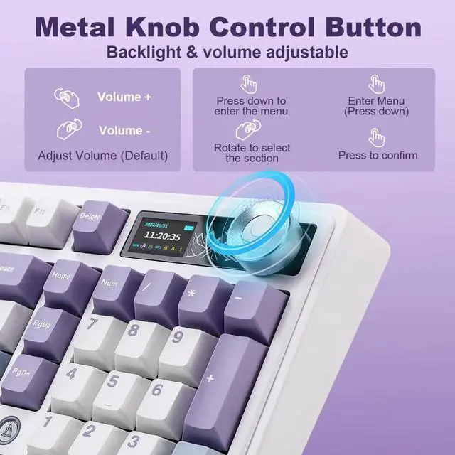 TFT Smart Display & Knob Design: This creamy keyboard with TFT display shows date, time, battery level, customized gif image, WIN/MAC layout, connection mode, at a glance. The knob adjusts the volume, the light, no need for complex settings, fingertip flick, precise control, innovative design, empowering for games and creative work, opening up a convenient control
