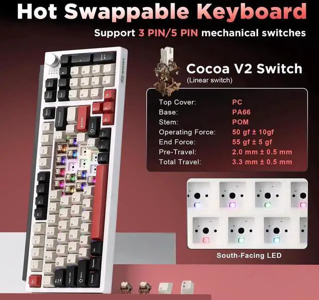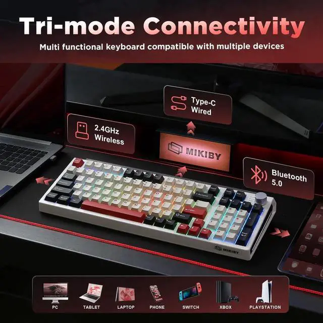 This three-mode wireless mechanical keyboard combines functionality and personalization, supporting Bluetooth 5.0, 2.4GHz, and USB-C connectivity options. It can pair with up to five devices simultaneously and is widely compatible with computers, tablets, smartphones, and gaming consoles. Featuring a hot-swappable design, users can freely replace 3-pin or 5-pin switches. Pre-lubricated linear switches provide a smooth and responsive typing experience. The keyboard features 16.8 million-color RGB backlighting with 16 lighting effects and a 4000mAh battery for extended battery life. The 98% compact layout retains the numeric keypad and function keys, saving space while maintaining practical efficiency. The unique pad design effectively reduces vibration and noise, while the multifunctional control knob allows one-touch switching between office and gaming modes, enabling quick adjustments to lighting, volume, and more, fully meeting the needs of creativity, gaming, and efficient office work