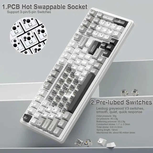 3. Hot swappable pcb keyboard, support 3 pins/5 pins switches;