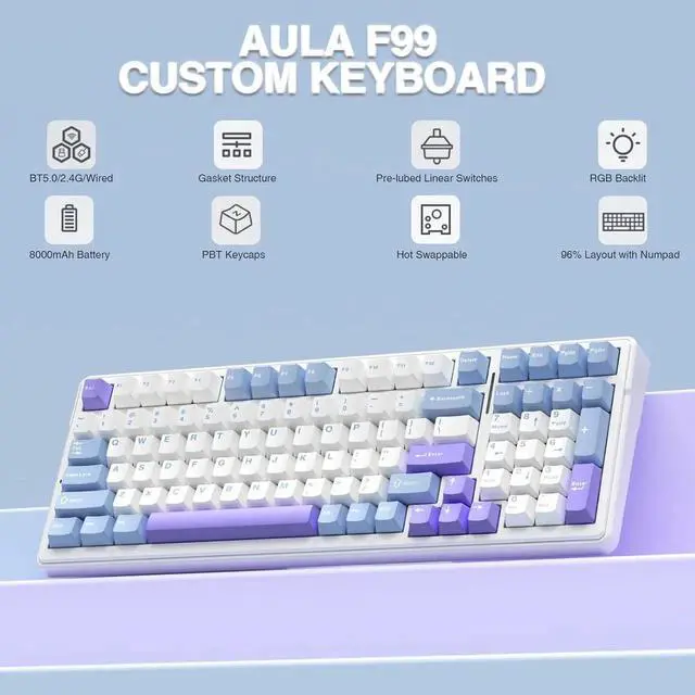 • Multi-Device ConnectionAULA F99 wireless mechanical keyboard provides three connection methods, including Bluetooth 5.0, 2.4GHz wireless mode, and USB C wired mode. It can be connected to up to five devices at the same time, and switch between them easily by FN+ combination keys. No limits about your keyboard connection to meet the needs of work, gaming, and study.