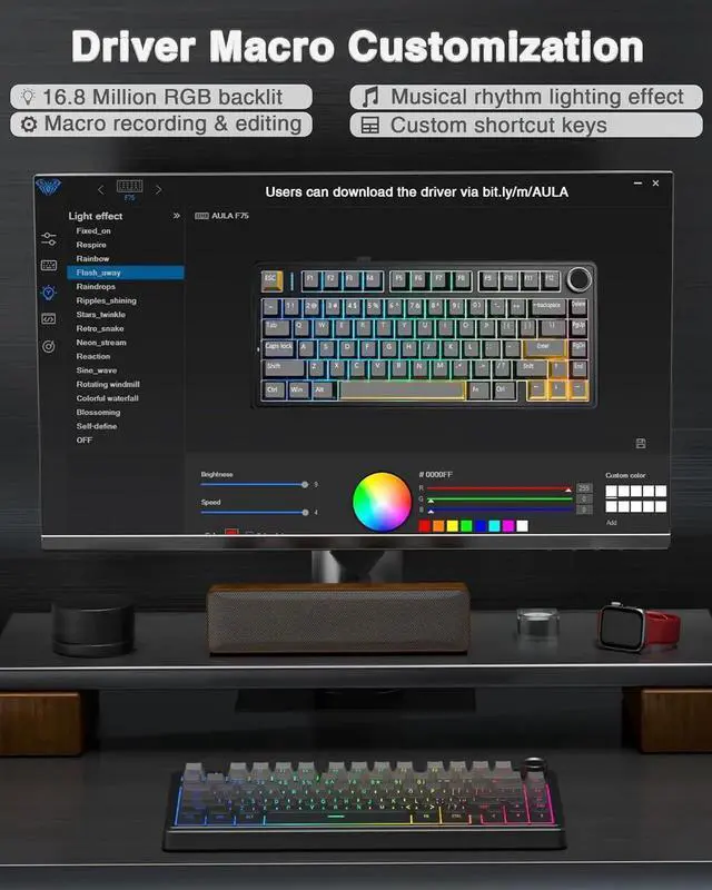 16.8 Million RGB Backlit: F75 Pro light up led keyboard features 16.8 million RGB lighting color. With 16 pre-set lighting effects to add a great atmosphere to the game. And supports 10 cool music rhythm lighting effects with driver. Lighting brightness and speed can be adjusted by the knob or the FN + key combination. You can select the single color effect as wish. And you can turn off the backlight if you do not need it