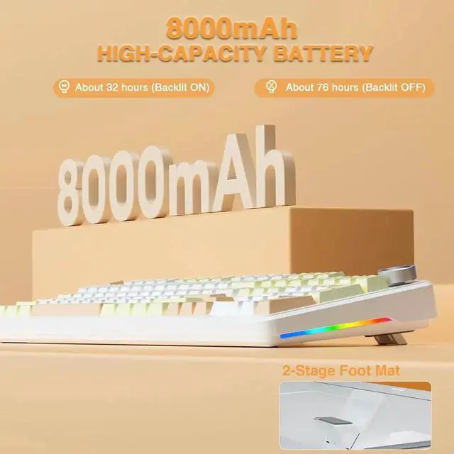 104 Keys Full Size Keyboard: The F108 Pro computer keyboard features a newly upgraded 100% full-size layout with arrow keys, function keys, and numeric zones for a more comfortable and productive office. The two-colour injection-moulded PBT keycaps are more durable without fading, sweat-proof, and softer to the touch. Built-in 8000mAh high-capacity battery, the creamy keyboard with number pad is suitable for long-time work or high-intensity gaming