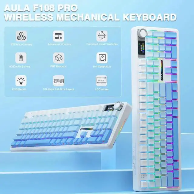 Smart Display Screen & Multi-function Knob: AULA F108 Pro wireless mechanical keyboard has built-in intelligent TFT color display screen, which can be used as an interactive interface for real-time updating and customization. The high-definition display and multi-function knobs are designed to make it easy to switch and update custom Gif images, volume, date and time, battery status, backlight and connection modes for greater ease of use(Note: You need to download the software under windows system and keep in wired mode to set the screen image/GIF, calibrate the date and time. The screen has a transparent protective film that can be torn off for use)