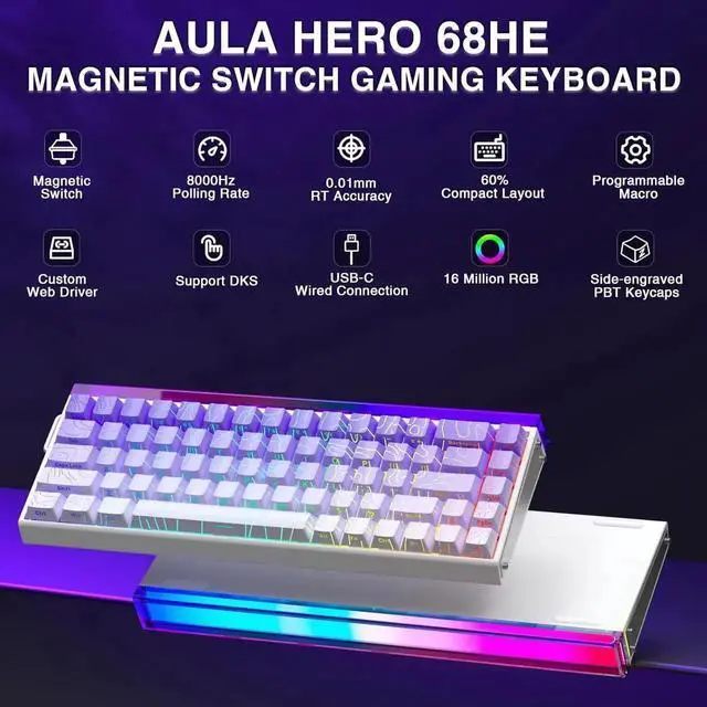 Hall Effect Magnetic Switch & Ultra-fast Response: Equipped with hall effect magnetic switches, the AULA HERO 68HE gaming keyboard has an ultra-fast 8K polling rate and ultra-low latency of 0.125ms to keep you ahead of the competition. Featuring premium construction and advanced magnetic switch technology, this hall effect keyboard ensures flexibility and superb response, perfect for FPS and other rhythm games
