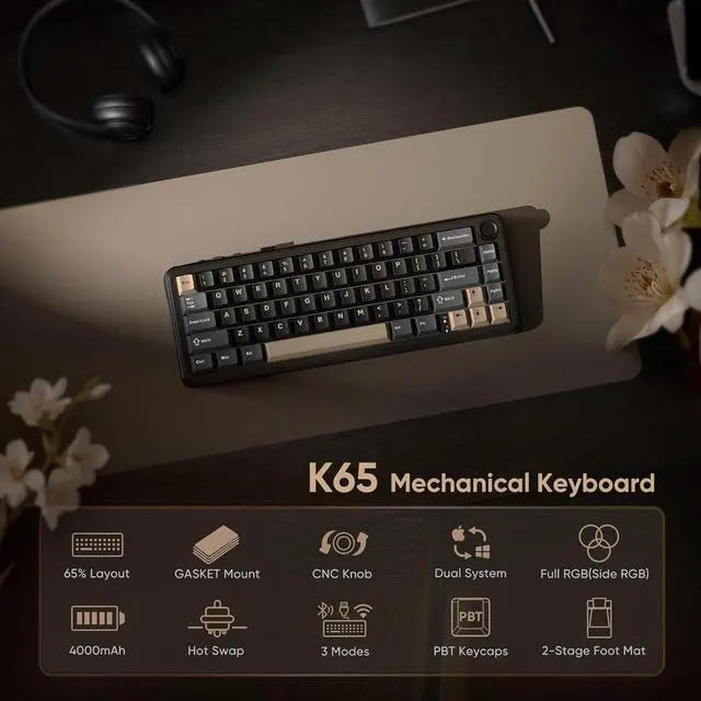 Full RGB & 4000mAh BatteryThe K65 mechanical keyboard with 1.68 million RGB colors and a rechargeable 4000mAh battery can light up diverse atmospheres. Use FN combinations, CNC knob, or software to set RGB light modes (like rhythm lights), color, speed, and brightness. FN + TAB can adjust side lighting modes. South-facing LEDs meet most keycap lighting requirements, including side-engraved ones. A charging indicator shows power needs & status, ensuring you never miss a charge for long-lasting use (opt for the original charging cable or a qualified data-capable one to charge via a computer's USB port).
