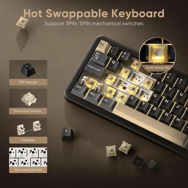 Hot Swappable SwitchesThe hot-swappable keyboard is a game-changer! Built-in hot-swap PCB lets you replace 3-pin or 5-pin switches without soldering, giving you a wide choice. Built-in pre-lubricated pink shafts make typing smooth and comfort. Comes with spare pre-lubricated shafts and a key puller for you to experiment with different switches freely to find the perfect feel for your typing style or gaming needs(Note: Not recommended for keyboard beginners. Or buy an extra set of front-character keycaps for replacement).