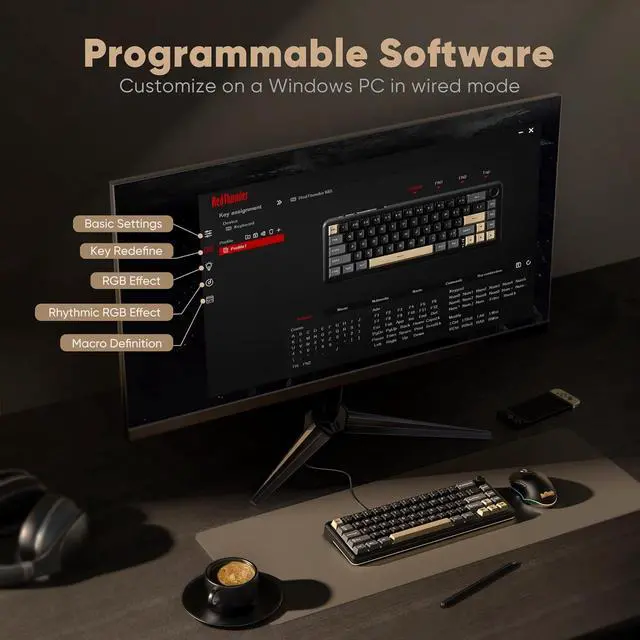 Programmable SoftwareProgrammable mechanical keyboard allows for deep customization of keyboard functions. Downloading the K65-US driver (only settable in 2.4G wireless or wired mode with Windows 10) enables comprehensive programmability, key mapping, macro definition and adjust key sensitivity, sleep time, debounce and backlight effects (including music rhythm backlight) to suit any workflow, gaming or life scenarios.