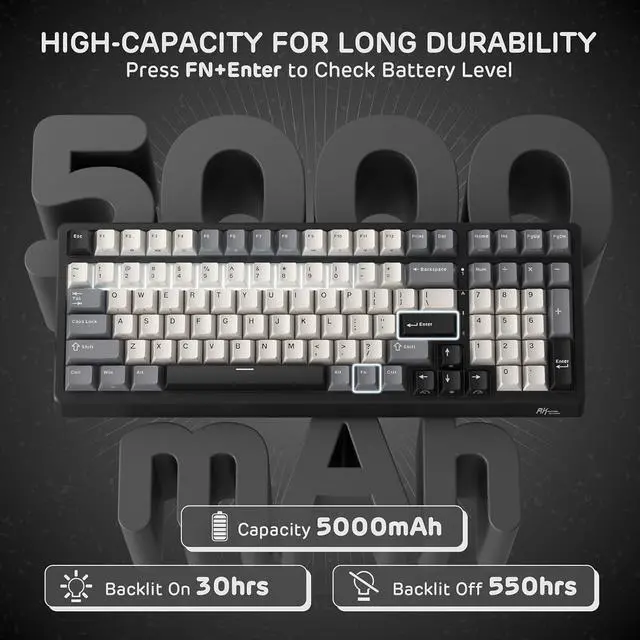4. Massive 5000 mAh Battery Boasting a high-capacity 5000 mAh battery, this 95% keyboard offers up to 550 hours of non-stop use with RGB backlight off and 30 hours with RGB on. Quickly check remaining power via FN+ENTER shortcut and recharge fully within 10 hours.