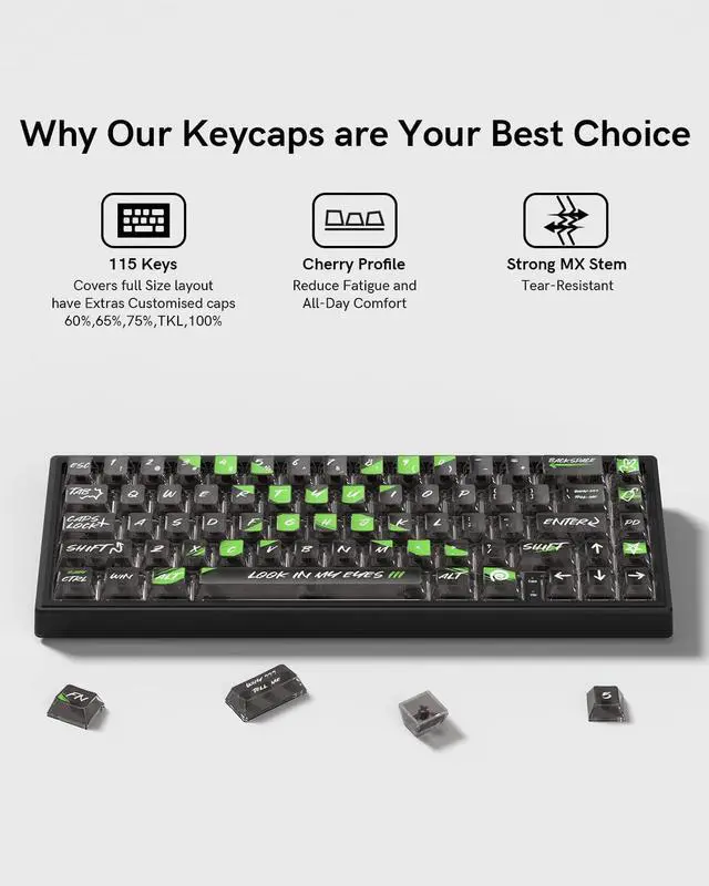 This 115-key set includes 104 standard keys and 9 modifier keys, designed to fit most ANSI US and UK layout mechanical keyboards with 61, 64, 68, 84, 87, 96, 98, 100, 104, and 108 keys—making it easy to customize your setup without compatibility concerns.