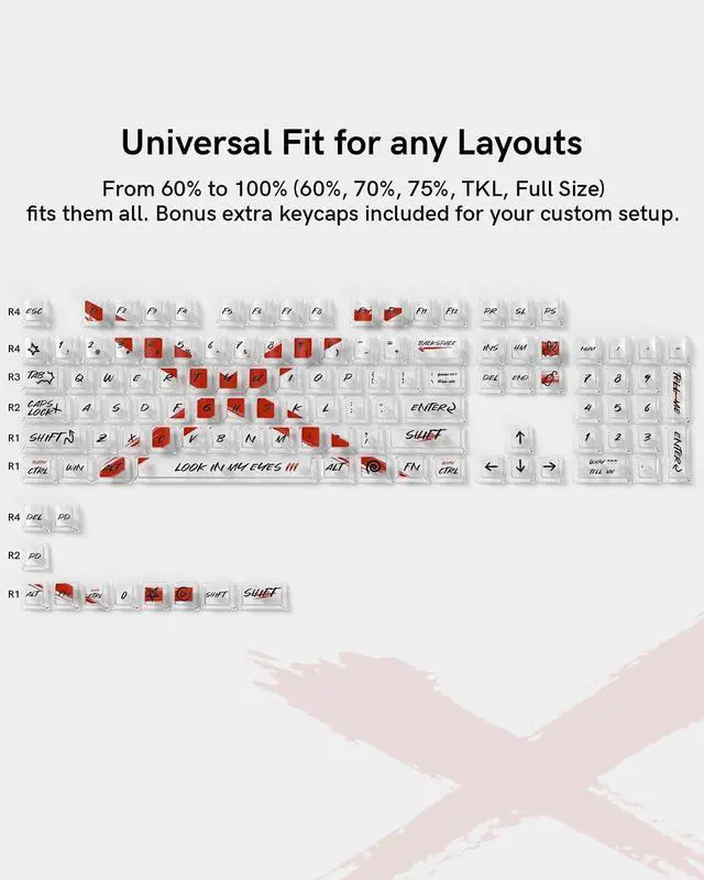 This 115-key set includes 104 standard keys and 9 modifier keys, designed to fit most ANSI US and UK layout mechanical keyboards with 61, 64, 68, 84, 87, 96, 98, 100, 104, and 108 keys—making it easy to customize your setup without compatibility concerns.