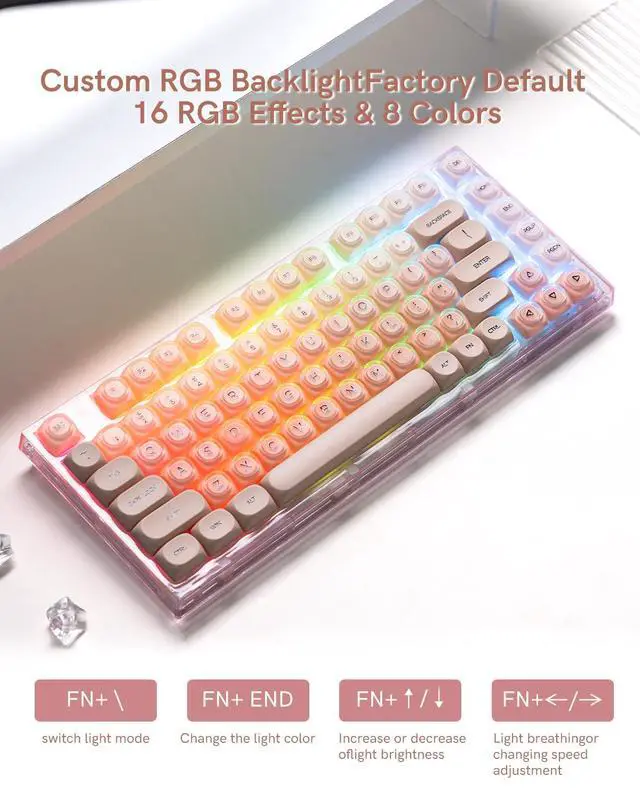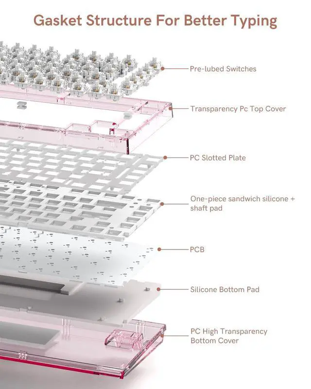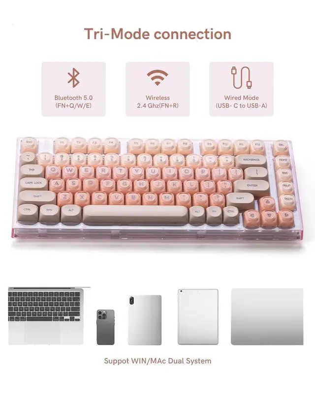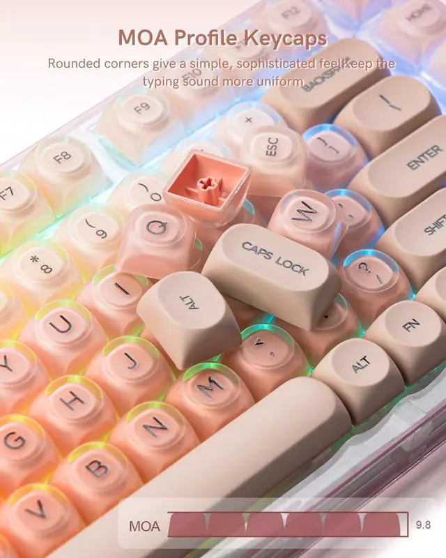 - Jelly MOA Profile Keycaps: The edge line of MOA keycaps is more rounded and curved sense is stronger, its unique design make it has higher stability and feel. Jelly keycaps features a distinctive jelly - like transparent design.he fresh light pink color offers an outstanding aesthetic, adding a dreamy atmosphere to your computer keyboards and making it stand out.