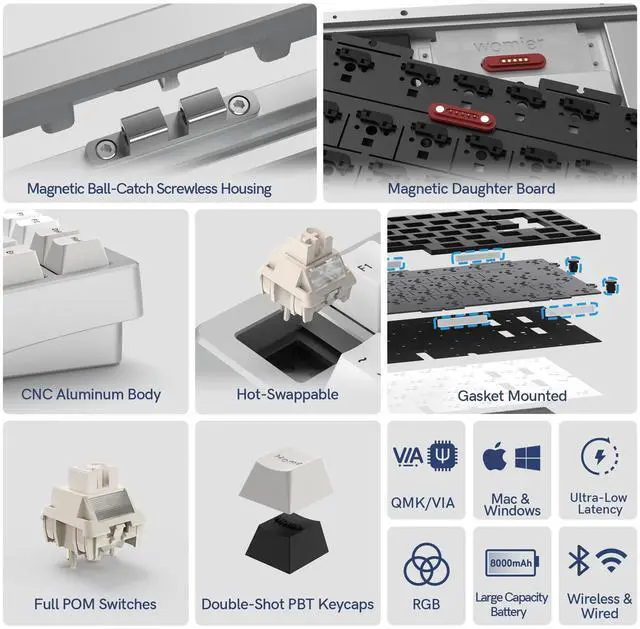 • Quick Release CNC Aluminum Gaming Keyboard: Meet the womier RD75, a 75% layout wireless QMK/VIA aluminum custom keyboard with tool-free Ball-Catch structure and magnetic PCB connector design to ensure your rapid disassembly experience. Fast Installation without screws or tools ball-catch design, Magnetic daughter board & magnetic metal badge.