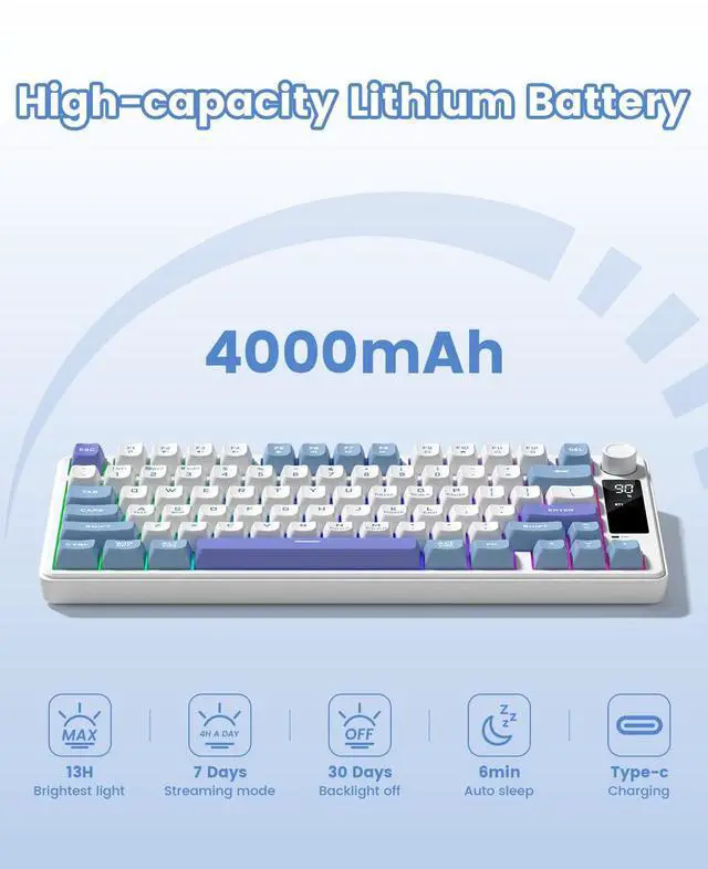 Powered by a 4000mAh rechargeable battery, your wireless gaming keyboard lasts for days on a single charge with auto-sleep for energy savings