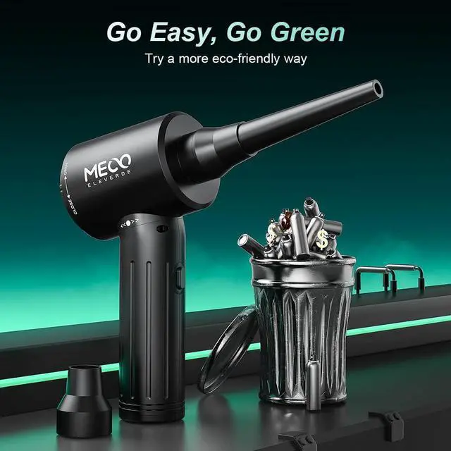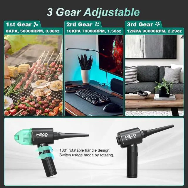 Powerful Cordless Air DusterMeco CR2 electric air duster uses a 90W brushless motor, and is proud of its 90, 000rpm motor, which can generate a strong thrust of nearly 10-level wind (25 meters/s) maximum output power for 12, 000Pa, it is enough to clean your home or quickly inflatable for mattress.
