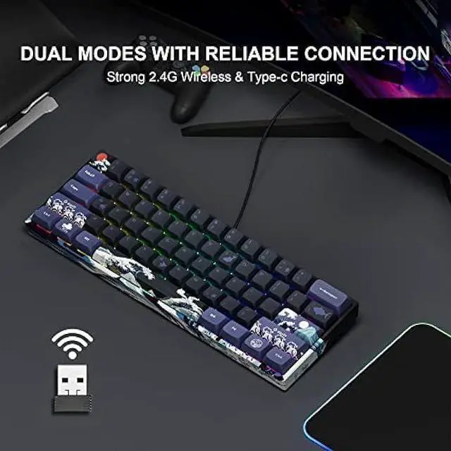 High-performance 2.4G Wireless KeyboardUp to 10m wireless working distance, enables the keyboard to achieve long-range wireless control. The receiver on the back of the keyboard. Play and plug, conveniently designed for gaming or office or home use. Two working modes, wired (Type C cable) and wireless, enjoy the freedom of being wireless while still not compromising performance by going wired.