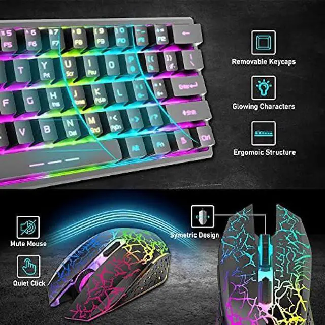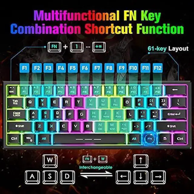 Compact TKL 60% LayoutThis wireless gaming keyboard is designed with minimalistic 61 key layout, mini size, utilize your desk room to the maximum extent, give more space for mouse movement, lightweight, wireless, and rechargeable feature make it portable, glowing character, removable keycaps, easy to clean and replace, no worry about wear out, FN key combination function make it easy to access to more keys function like a full size keyboard, very practical.