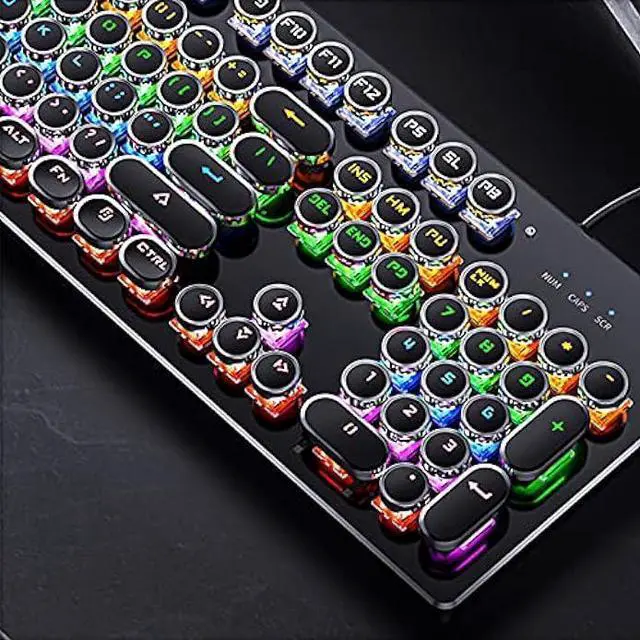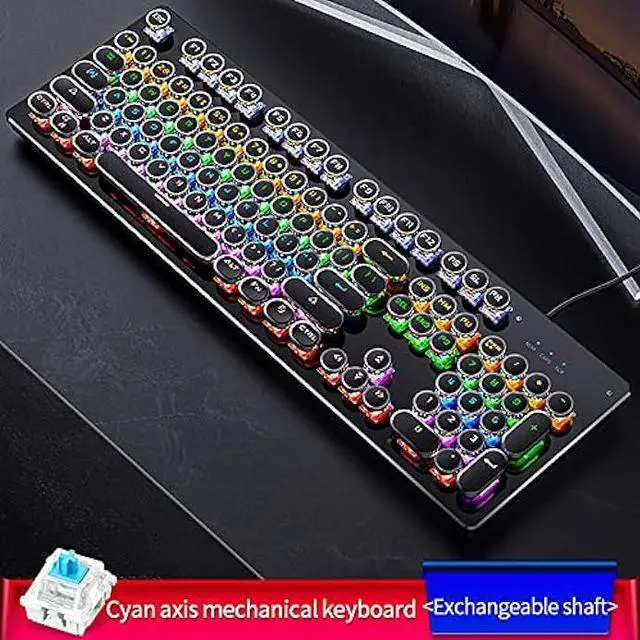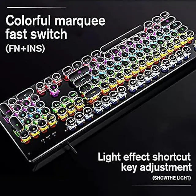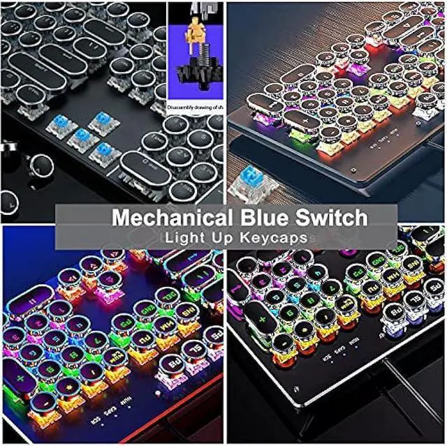Mechanical Blue Switch Gaming Keyboard- Mechanical Blue Switch Gaming Keyboard (Cherry Blue Equivalent) for ultimate gaming performance. Retro keycap looks like a classical typewriter, brings you comfortable typing feeling & stable clicking touch. The Mechanical Keyboard Keys offer medium resistance, audible Click Sound & Tactile Feedback. Sensitive and Responsive. Easy to press and fast response.