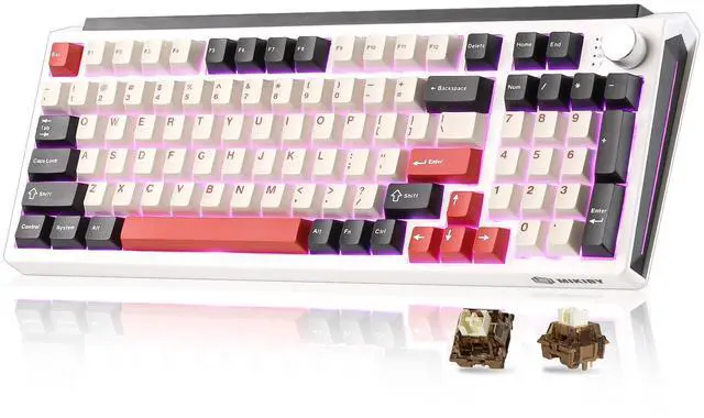 This three-mode wireless mechanical keyboard combines functionality and personalization, supporting Bluetooth 5.0, 2.4GHz, and USB-C connectivity options. It can pair with up to five devices simultaneously and is widely compatible with computers, tablets, smartphones, and gaming consoles. Featuring a hot-swappable design, users can freely replace 3-pin or 5-pin switches. Pre-lubricated linear switches provide a smooth and responsive typing experience. The keyboard features 16.8 million-color RGB backlighting with 16 lighting effects and a 4000mAh battery for extended battery life. The 98% compact layout retains the numeric keypad and function keys, saving space while maintaining practical efficiency. The unique pad design effectively reduces vibration and noise, while the multifunctional control knob allows one-touch switching between office and gaming modes, enabling quick adjustments to lighting, volume, and more, fully meeting the needs of creativity, gaming, and efficient office work