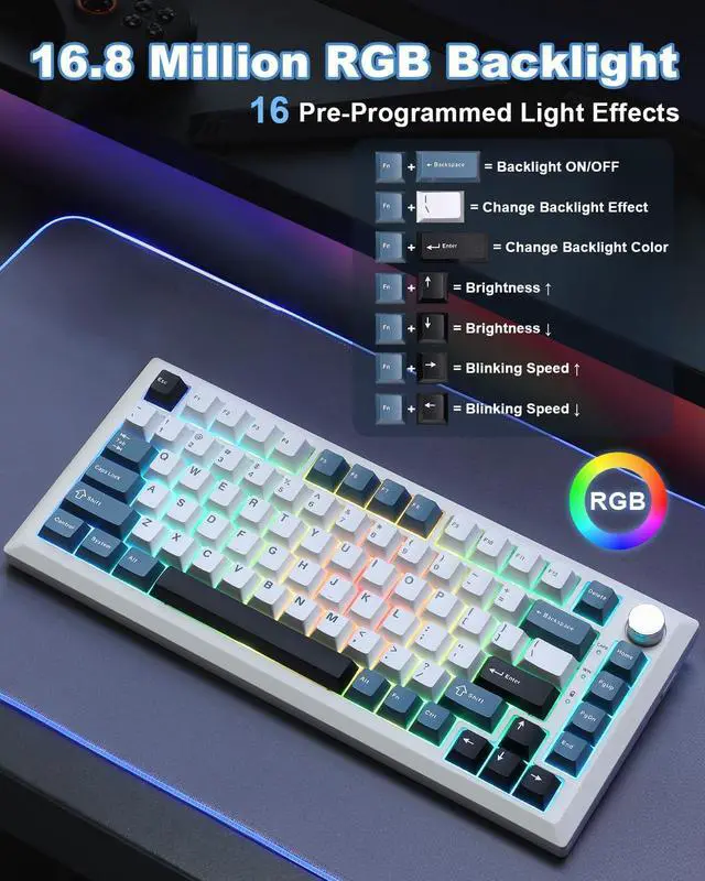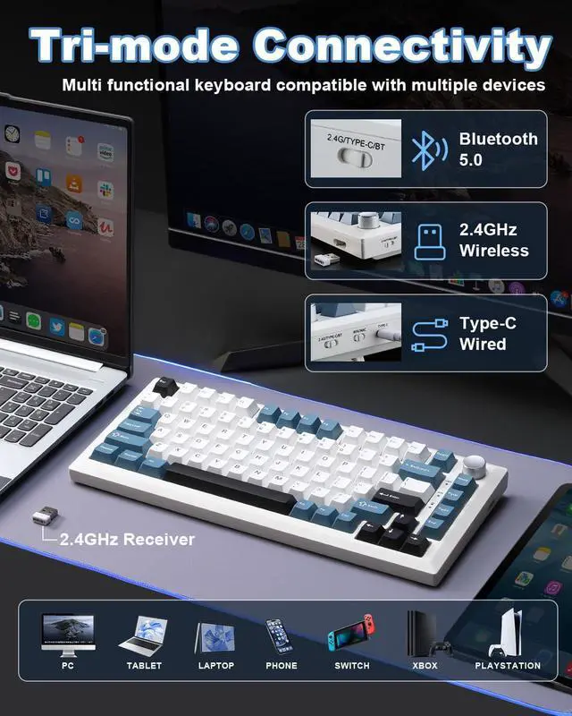 Y75 Tri-mode Mechanical Keyboard -Supports Bluetooth 5.0/2.4GHz/USB-C tri-mode connectivity, compatible with PC/mobile/game consoles. Hot-swappable shaft base is compatible with 3/5-pin mechanical shaft, zero threshold for DIY feel.16.8 million colors RGB backlight + 16 kinds of light effects, 82-key compact layout retains directional keys, PBT dual-color keycaps resist oiling. Multi-function knob intelligent switching game/office mode, adjust the light/volume with one click