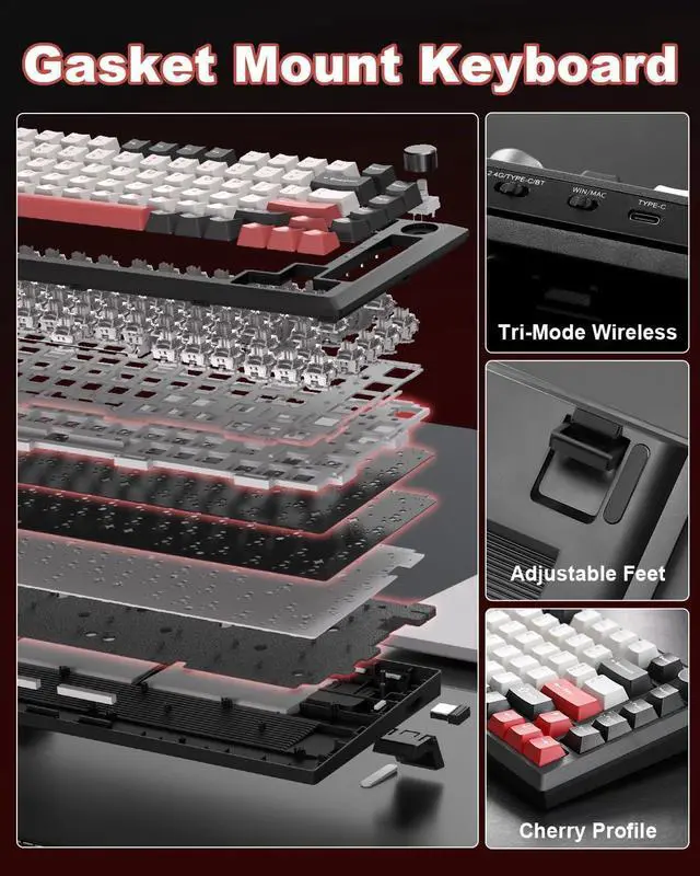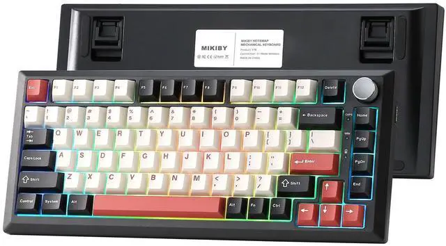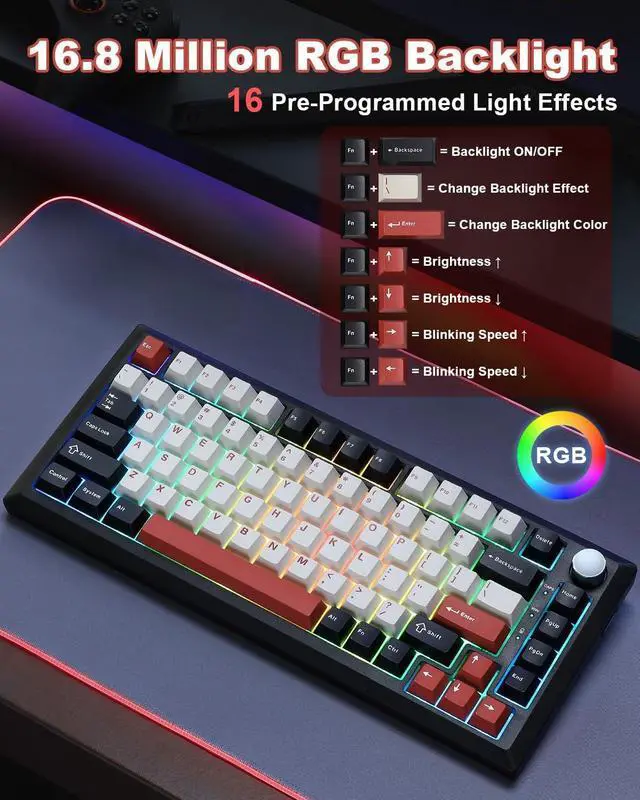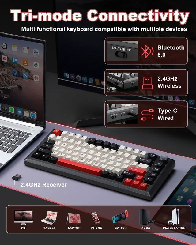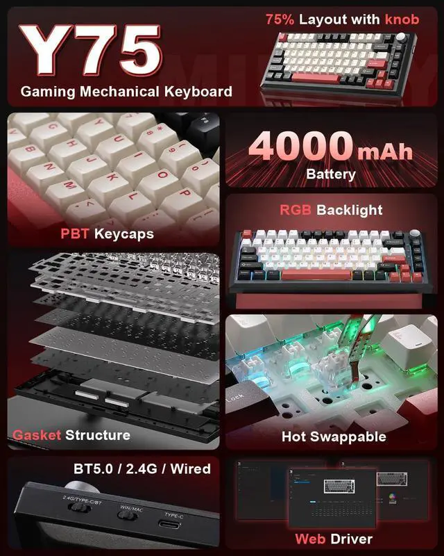 Y75 Tri-mode Mechanical Keyboard -Supports Bluetooth 5.0/2.4GHz/USB-C tri-mode connectivity, compatible with PC/mobile/game consoles. Hot-swappable shaft base is compatible with 3/5-pin mechanical shaft, zero threshold for DIY feel.16.8 million colors RGB backlight + 16 kinds of light effects, 82-key compact layout retains directional keys, PBT dual-color keycaps resist oiling. Multi-function knob intelligent switching game/office mode, adjust the light/volume with one click
