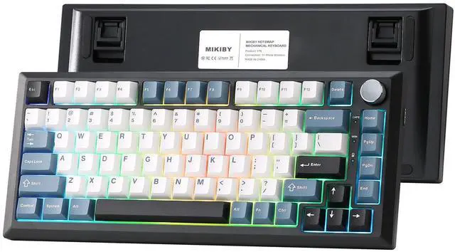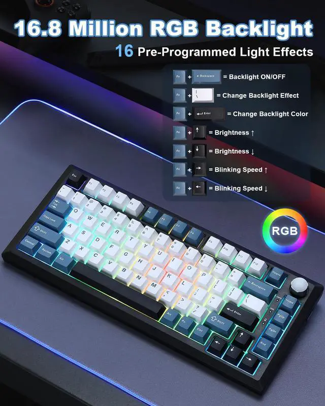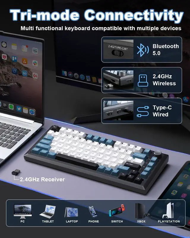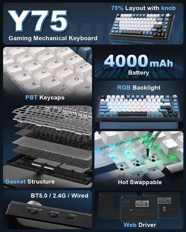Y75 Tri-mode Mechanical Keyboard -Supports Bluetooth 5.0/2.4GHz/USB-C tri-mode connectivity, compatible with PC/mobile/game consoles. Hot-swappable shaft base is compatible with 3/5-pin mechanical shaft, zero threshold for DIY feel.16.8 million colors RGB backlight + 16 kinds of light effects, 82-key compact layout retains directional keys, PBT dual-color keycaps resist oiling. Multi-function knob intelligent switching game/office mode, adjust the light/volume with one click