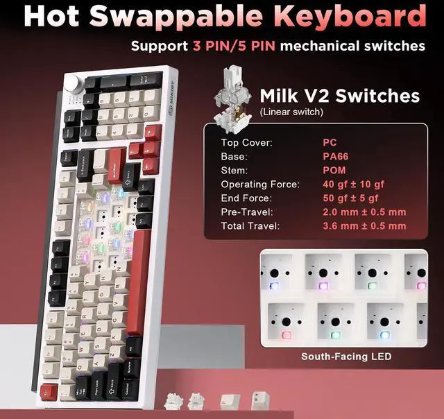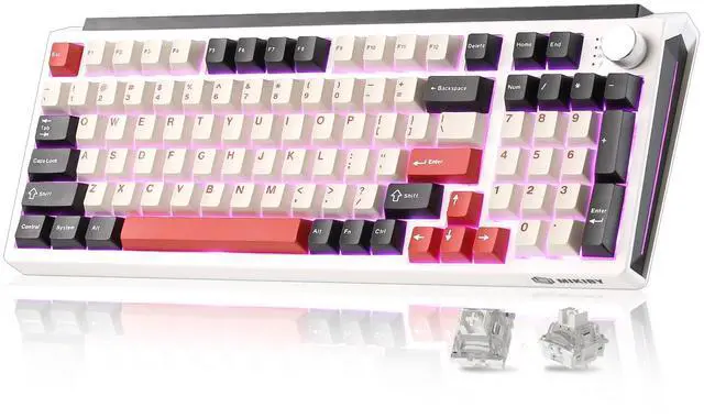 This three-mode wireless mechanical keyboard combines functionality and personalization, supporting Bluetooth 5.0, 2.4GHz, and USB-C connectivity options. It can pair with up to five devices simultaneously and is widely compatible with computers, tablets, smartphones, and gaming consoles. Featuring a hot-swappable design, users can freely replace 3-pin or 5-pin switches. Pre-lubricated linear switches provide a smooth and responsive typing experience. The keyboard features 16.8 million-color RGB backlighting with 16 lighting effects and a 4000mAh battery for extended battery life. The 98% compact layout retains the numeric keypad and function keys, saving space while maintaining practical efficiency. The unique pad design effectively reduces vibration and noise, while the multifunctional control knob allows one-touch switching between office and gaming modes, enabling quick adjustments to lighting, volume, and more, fully meeting the needs of creativity, gaming, and efficient office work