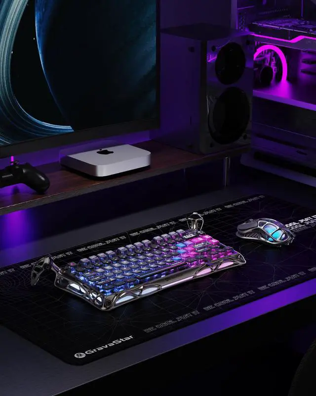 Design Size: 415*178.6*57.6 mm Weight: 1.18kg Streamlined 75% layout with 79 keys + Control Knob Programmable control knob for enhanced functionality Double-shot PBT keycaps Sturdy metal construction for premium quality Mechanical Switches Custom GravaStar x Kailh Speedy Mint linear key switches 45gf actuation force, 1.2mm pre-travel, 3.5mm total travel Smooth linear switch characteristics Construction Gasket-mounted design for improved typing feel 5 layers of sound dampening foam for premium acoustics Gasket-mounted FR4 material plate Lighting Dual independent RGB backlighting systems Customizable RGB lighting effects Power Large 8000mAh rechargeable battery Tri-mode connectivity (wired, Bluetooth, 2.4GHz wireless) Packaging List 1 x Keyboard 1 x Type-A 2.4GHz Receiver 1 x Type-A to Type-C Cable 1 x Keycap & Switch 2-in-1 Puller 1 x Cleaning Brush 4 x Extra Switches (1 x Kailh Platycodon Switch, 1 x Kailh Crackle Ice Box Switch, 1 x KTT Silent Blue Switch, 1 x KTT Baby White Switch) 1 x User Manual 1 x Cleaning Cloth