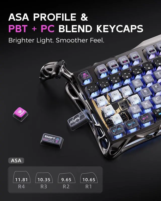 • Dual RGB Lighting & Pudding PBT Keycaps - Elevate your setup with dual independent RGB lighting systems offering 16.8 million colors and 13 lighting modes. The south-facing backlit keys and stylish Pudding PBT keycaps with dye-sublimation art ensure vibrant, customizable lighting that enhances both aesthetics and visibility.