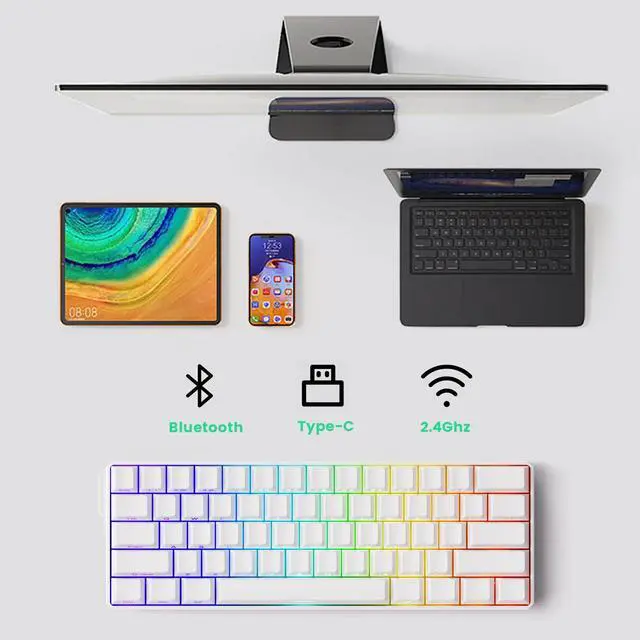 FUN60 can be connected to multiple devices through bluetooth 5.0, multi-host 2.4Ghz (with a receiver), and wired Type-C modes with easy switch