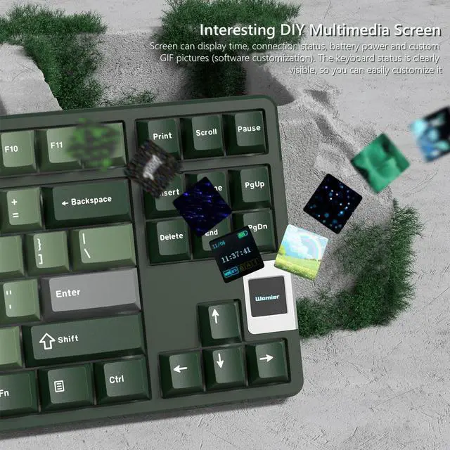 • [75% Keyboard with Colorful Screen] QK87 wireless gaming keyboard has a built-in TFT smart display screen, which can display time, connection status, battery level and custom GIF images (customized by software). The keyboard status is clearly visible and you can easily customize it. The keyboard adopts the color matching of jungle nature, which allows you to experience a unique relaxed atmosphere in games or work.