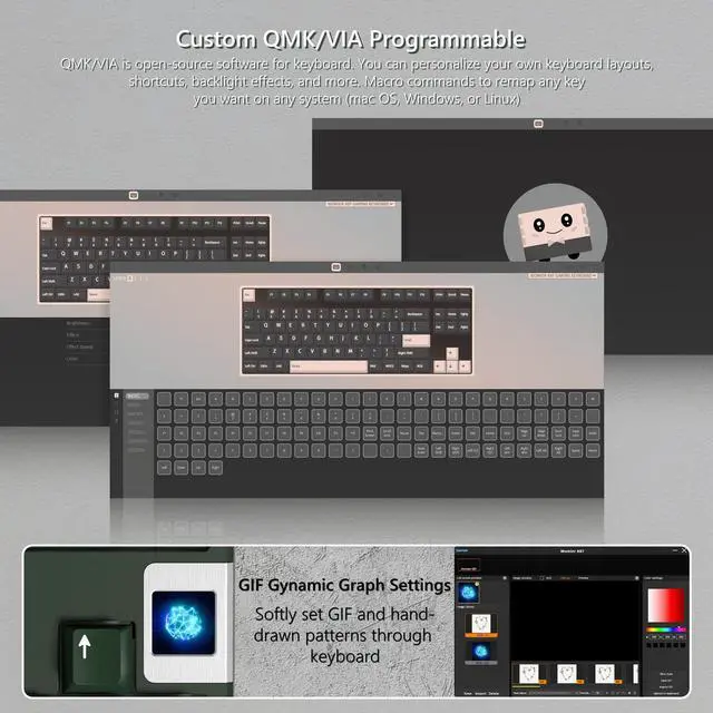 • [Custom Keyboard QMK/VIA Programmable] QMK/VIA is open-source software for keyboards that allows anyone to program and remap each key easily and quickly. You can personalize your own keyboard layouts, shortcuts, backlight effects, and more. Macro commands to remap any key you want on any system (mac OS, Windows, or Linux). Note: User can remap a key on wired mode only. Once it's done, the keymap will work on both wireless and wired modes.
